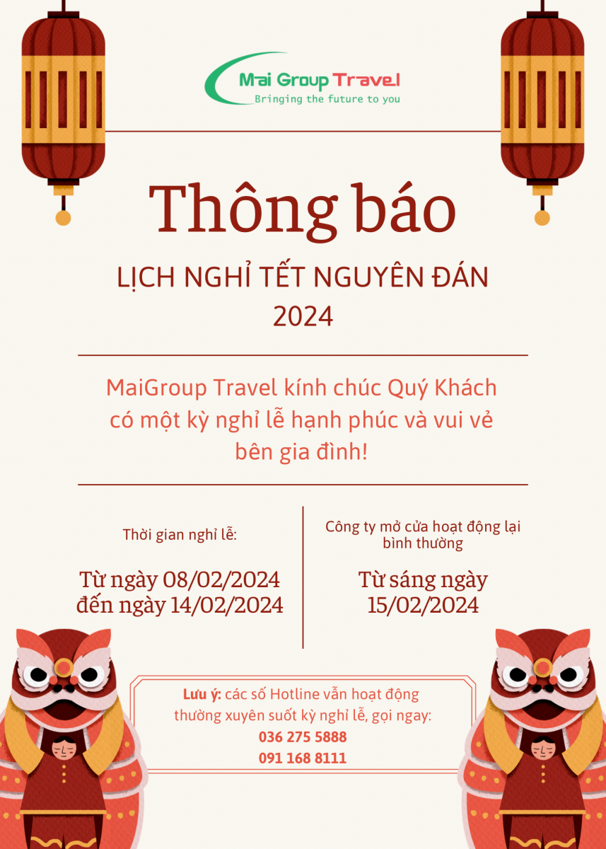 Maigroup Travel xin được gửi tới quý khách về lịch nghỉ Tết Nguyên Đán 2024 như sau: