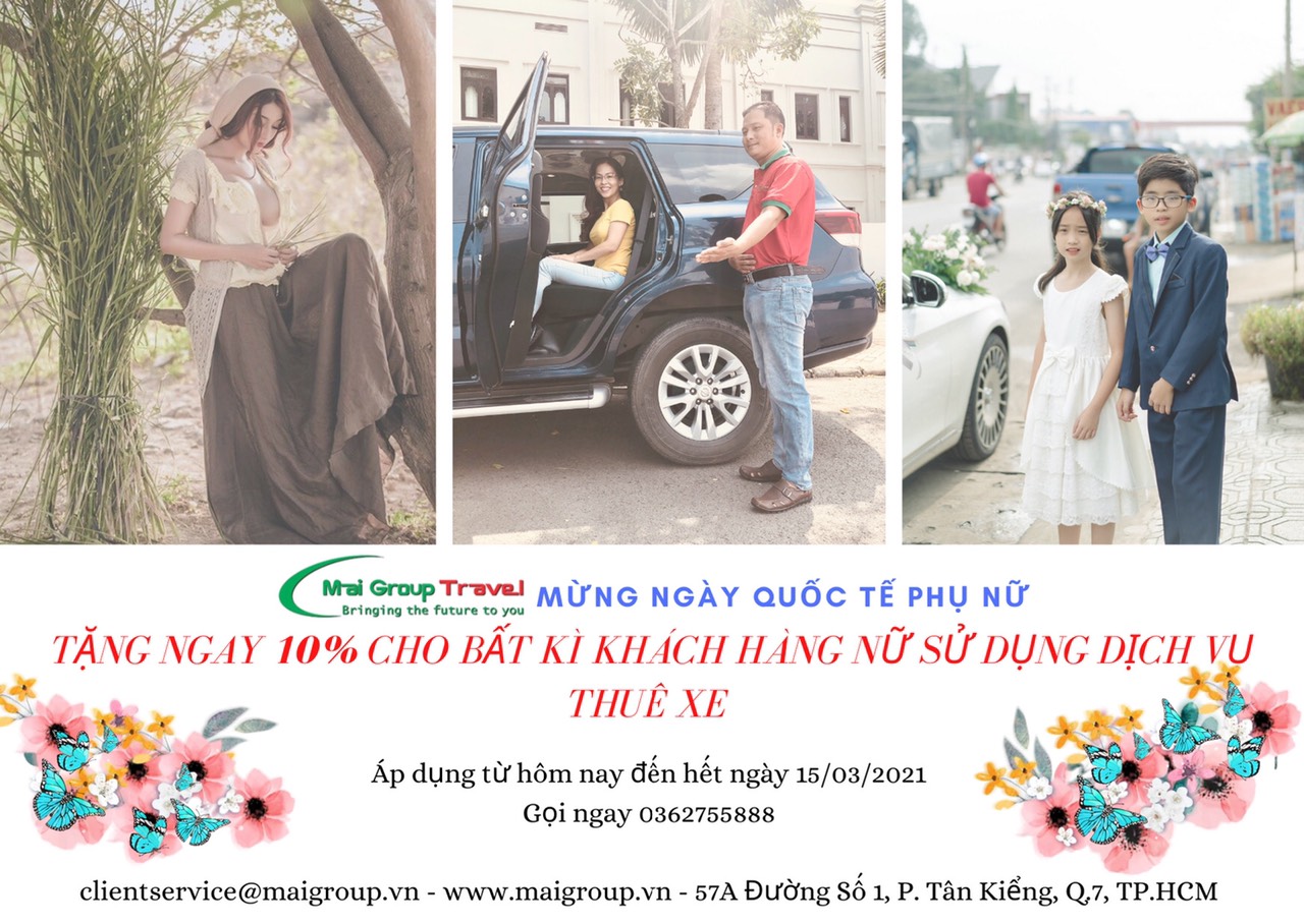 Maigroup Travel trân trọng dành tặng món quà trị giá 10% cho tất cả các khách hàng nữ sử dụng dịch vụ xe cho thuê của chúng tôi kể từ hôm nay đến hết ngày 15/03/2021.